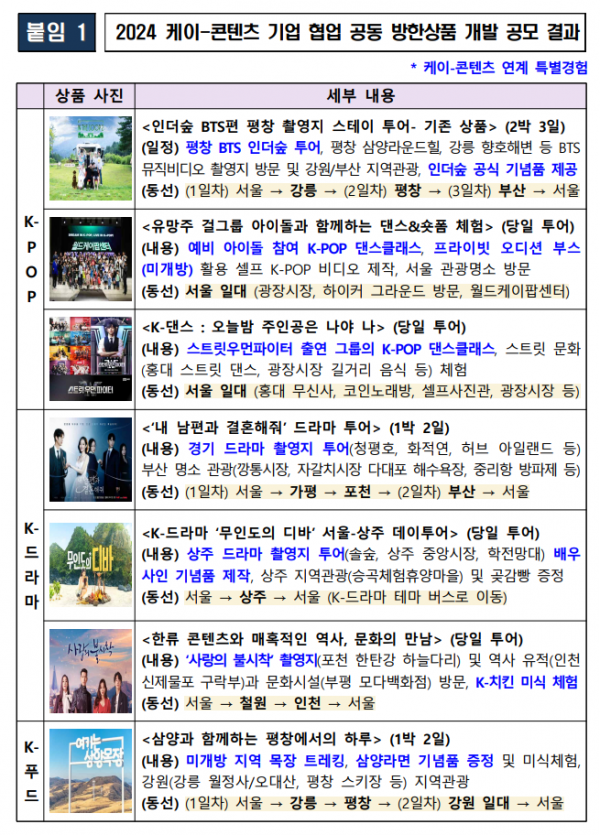 문화체육관광부(장관 유인촌, 이하 문체부)와 한국관광공사(이하 관광공사)는 국내 여행사와 케이-콘텐츠 기업이 협력해 만든 방한상품 7종을 선정해 개발과 홍보를 지원한다. 이번에 선정된 방한상품은 케이-팝과 케이-드라마, 케이-푸드 등의 명소를 방문하고, 기존에 없던 특별한 체험을 할 수 있는 기회를 제공하는 관광상품이다.